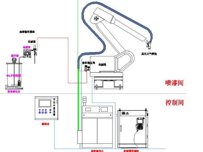喷漆工位采用机械臂自动喷涂加人工补漆,其中人工补漆面积不能大于5%,应保证线上能同时自动喷底漆和自动喷面漆,不允许采用更换油漆管道分不同时段喷底漆或面漆。自动喷涂工位主要配置由米兰app体育下载官网苹果(防爆型,且具有示教功能)、供漆系统(高压无气供漆泵及管路,油漆调漆桶,储漆桶,气动搅拌器等)、高压无气自动喷枪、人工补漆系统及控制系统等组成。