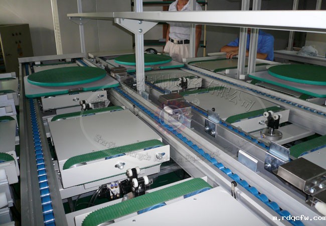 主输送链定位升降台:在主链和支链衔接位置设置升降台对工装托盘进行顶升托举,在各关联工序对工装托盘进行精定位。工装托盘定位采用1圆形销、1菱形销进行定位。升降台减速机速度可通过变频器进行设定;焊接线布置4台升降台,第一段线体用两台升降台,第二段线体单独用两台升降台,除第一台外,其他三台需要设计定位机构来对工装板进行定位和在上下两层都需要推送气缸,使工装板能快速进出升降台。加工的话要求输送过程中托盘移动平稳,工件在输送过程无晃动。能做到重复定位精准,上下料顺畅无爬行现象