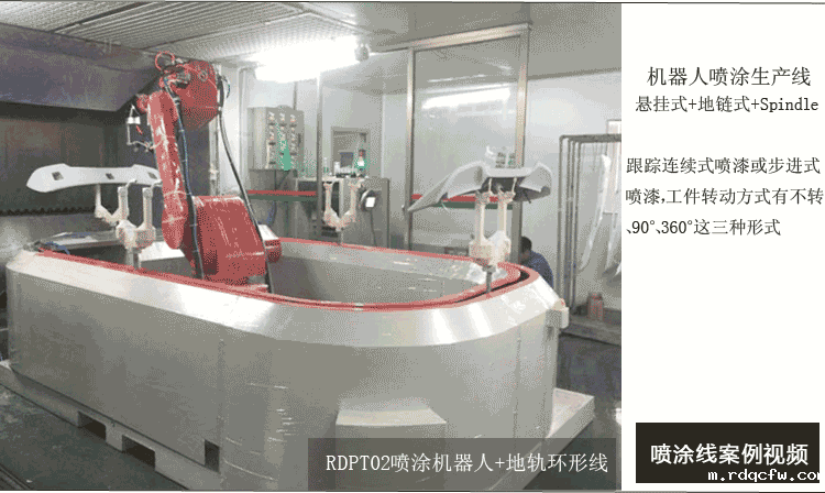 机器人是6轴自动涂装机器人,被广范应用到木制品,金属件,塑料件等领域的喷涂喷工作,机器人喷涂线生产节拍允许最大链速3米/分钟,机器人喷外表面和人工喷内表面相结合实现工件全覆盖喷涂。喷涂漆料使用单组份溶剂型涂料,喷枪用的是自动空气静电喷枪。